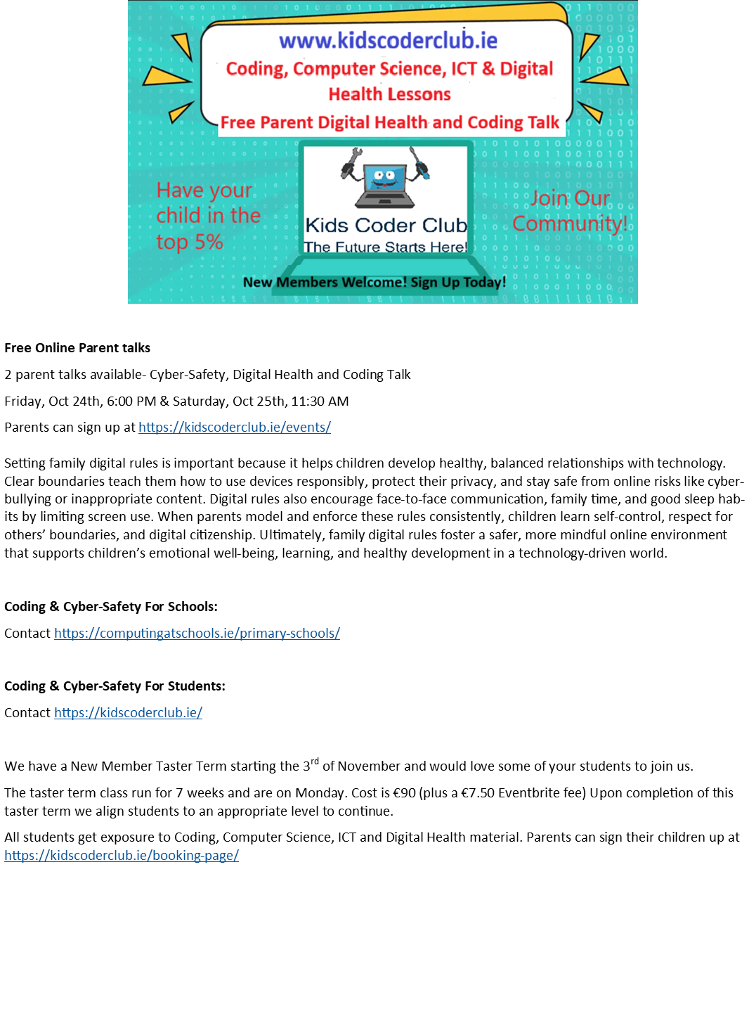 Please see details attached for online Parent Workshops available from KidsCoderClub.ie