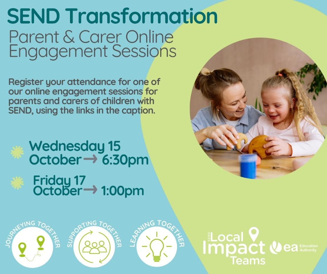 The Education Authority’s SEND Transformation Team invite you to our online Parent & Carer Engagement Sessions on 15th and 17th October. These sessions will provide and update on SEND Transformation progress to date and, and what this means for you and your children. To register your attendance to either of our events, please click one of the links below: